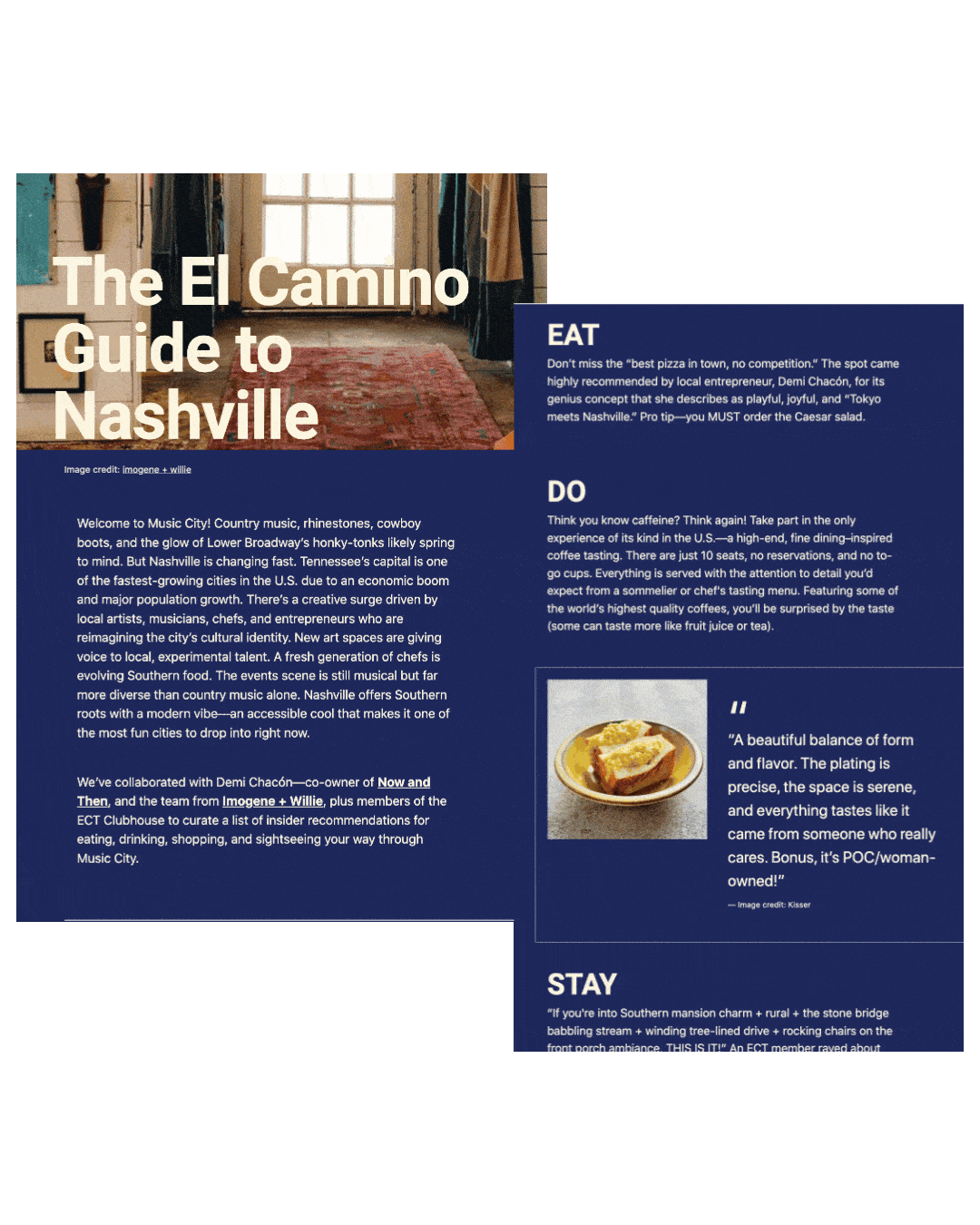 Led the content and curation strategy for 50+ destination guides - the core value of El Camino's Clubhouse membership. This meant setting editorial direction for each destination, briefing and editing other writers, identifying local creatives and experts to collaborate with, and writing guides myself in El Camino's tone. Every guide was built around avoiding stereotypes, ensuring diverse representation, spotlighting locally owned businesses and ensuring El Camino’s unique lens on a destination came through every time.